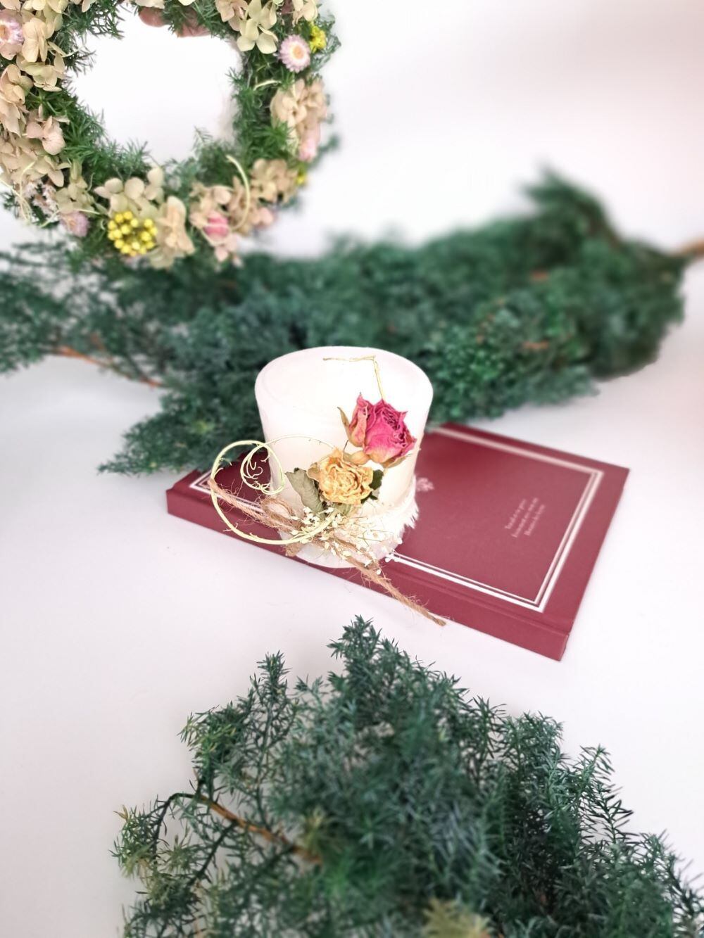 ドライフラワーのバラを装飾した、優しいホワイトカラーのソイキャンドルと、春のお花畑をイメージしたリースをセットにしています。