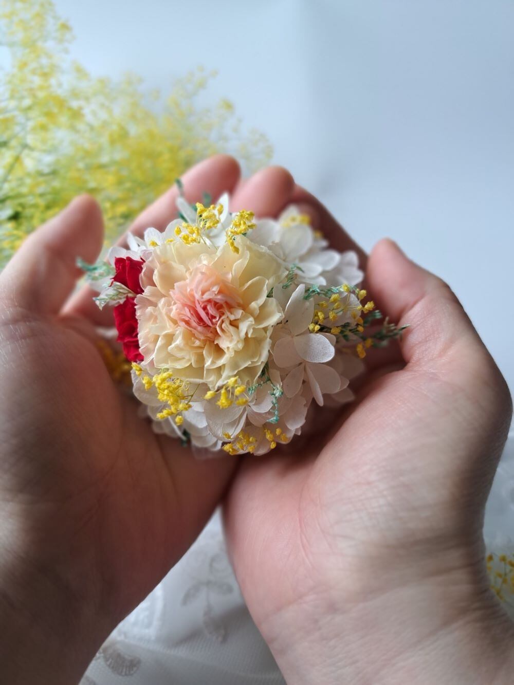 コサージュには、トップにプリザーブドフラワーのカーネーションを使い、サイドにはプリザーブドフラワーの深紅のバラや、オフホワイトのアジサイやカスミソウを飾っています。